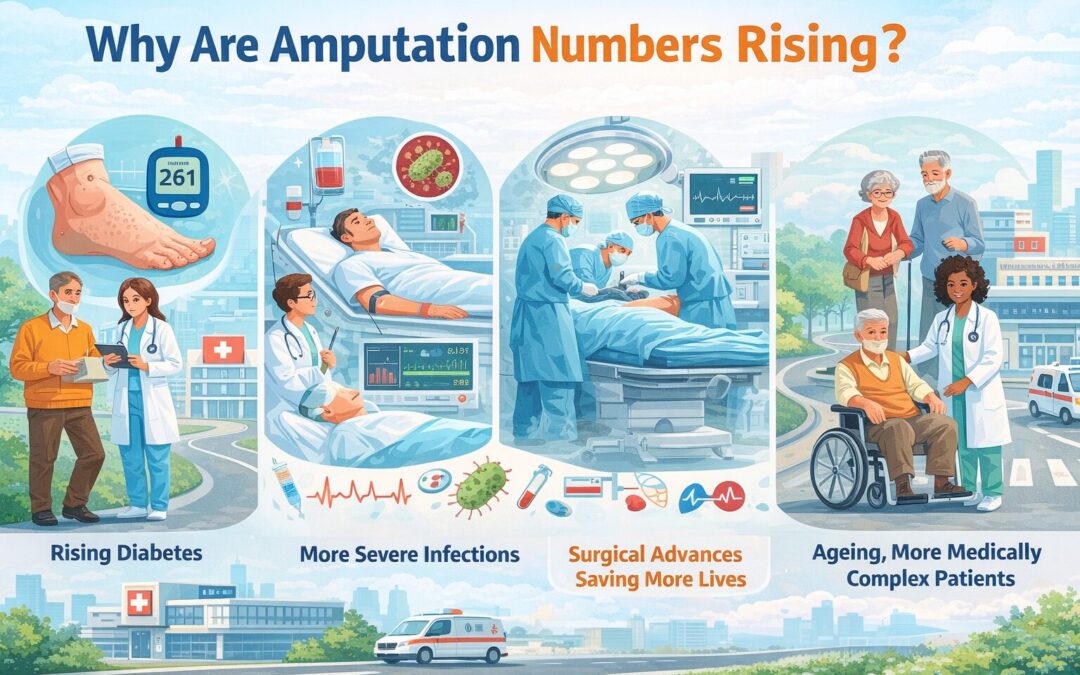 A fourth reason is an ageing and more medically complex population. Older age, peripheral arterial disease, kidney disease, poor glycaemic control and sepsis are all associated with worse limb outcomes and higher mortality after major lower-limb amputation. So as the population becomes older and more clinically complex, the pool of people at risk also grows.